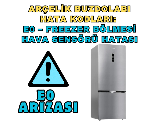 Arçelik buzdolabı E0 hatası, E0 hata kodu nedir, buzdolabı freezer sensör arızası, Arçelik buzdolabı hata kodları, E0 hata kodu nasıl çözülür, buzdolabı soğutmuyor, Arçelik teknik destek, buzdolabı hava sensörü temizliği, buzdolabı parça değişimi, Arçelik yetkili servis, buzdolabı bakım ipuçları, buzdolabı hata mesajları