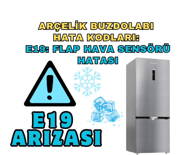 Arçelik buzdolabı E19 hatası, E19 hata kodu nedir, buzdolabı flap hava sensör arızası, Arçelik buzdolabı hata kodları, E19 hata kodu nasıl çözülür, buzdolabı soğutmuyor, Arçelik teknik destek, buzdolabı flap sensörü temizliği, buzdolabı parça değişimi, Arçelik yetkili servis, buzdolabı bakım ipuçları, buzdolabı hata mesajları