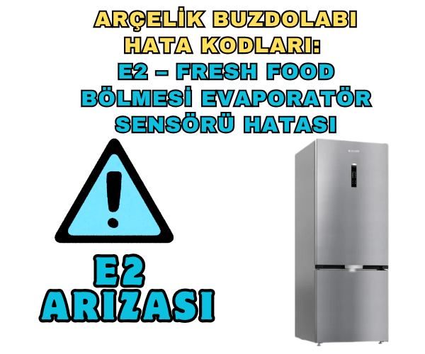 Arçelik buzdolabı E2 hatası, E2 hata kodu nedir, buzdolabı evaporatör sensör arızası, fresh food sensör hatası, Arçelik buzdolabı hata kodları, E2 hata kodu nasıl çözülür, buzdolabı soğutmuyor, Arçelik teknik destek, buzdolabı evaporatör sensörü temizliği, buzdolabı parça değişimi, Arçelik yetkili servis, buzdolabı bakım ipuçları, buzdolabı hata mesajları