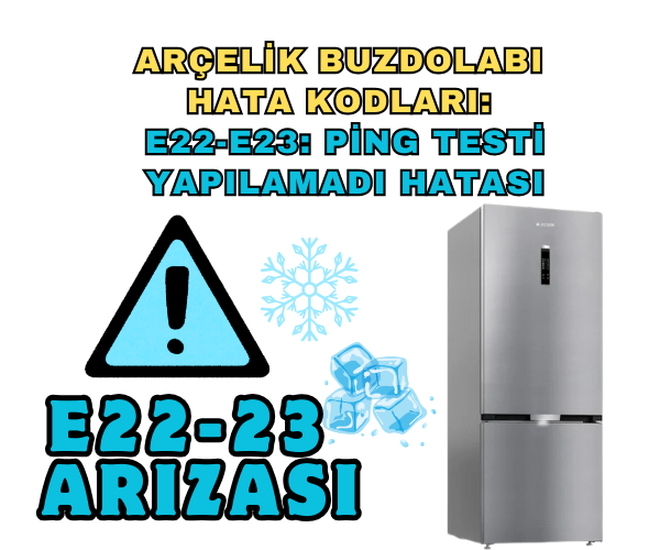 Arçelik buzdolabı E22 hatası, Arçelik buzdolabı E23 hatası, ping testi yapılamadı, buzdolabı internet bağlantısı sorunu, Arçelik akıllı buzdolabı hataları, E22 E23 hata kodları nedir, buzdolabı Wi-Fi bağlanmıyor, Arçelik teknik destek, buzdolabı ağ bağlantısı sorunu, Arçelik yetkili servis, buzdolabı internet hatası nasıl çözülür, akıllı buzdolabı bağlantı problemi