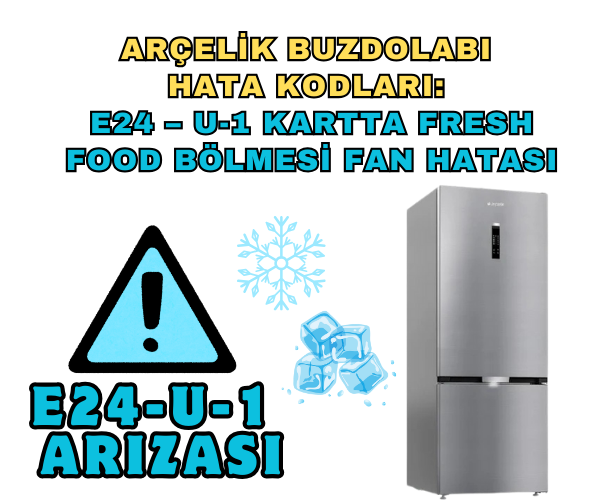 Arçelik buzdolabı E24 hatası, E24 hata kodu nedir, buzdolabı U-1 kart fan arızası, fresh food fanı çalışmıyor, Arçelik buzdolabı hata kodları, E24 hata kodu nasıl çözülür, buzdolabı soğutmuyor, Arçelik teknik destek, buzdolabı U-1 kontrol kartı arızası, buzdolabı parça değişimi, Arçelik yetkili servis, buzdolabı bakım ipuçları, buzdolabı internet bağlantısı, akıllı buzdolabı hata mesajları