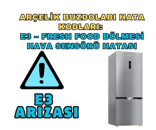 Arçelik buzdolabı E3 hatası, E3 hata kodu nedir, buzdolabı fresh food sensör arızası, Arçelik buzdolabı hata kodları, E3 hata kodu nasıl çözülür, buzdolabı soğutmuyor, Arçelik teknik destek, buzdolabı hava sensörü temizliği, buzdolabı parça değişimi, Arçelik yetkili servis, buzdolabı bakım ipuçları, buzdolabı hata mesajları