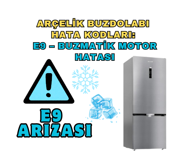 Arçelik buzdolabı E9 hatası, E9 hata kodu nedir, buzdolabı buzmatik motor arızası, buz üretmiyor, Arçelik buzdolabı hata kodları, E9 hata kodu nasıl çözülür, buzdolabı soğutmuyor, Arçelik teknik destek, buzdolabı buz üretici motoru, buzdolabı parça değişimi, Arçelik yetkili servis, buzdolabı bakım ipuçları, buzdolabı hata mesajları