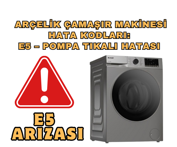 Arçelik çamaşır makinesi E5 hatası, E5 hata kodu nedir, çamaşır makinesi pompa tıkalı, pompa filtresi temizliği, Arçelik çamaşır makinesi hata kodları, E5 hata kodu nasıl çözülür, çamaşır makinesi su atamıyor, Arçelik teknik destek, çamaşır makinesi pompa arızası, Arçelik yetkili servis, çamaşır makinesi bakım ipuçları, çamaşır makinesi su tahliyesi problemi