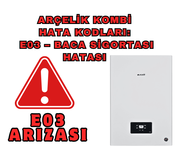 Arçelik kombi E03 hatası, E03 hata kodu nedir, kombi baca sigortası arızası, baca sıcaklığı aşımı, Arçelik kombi hata kodları, E03 hata kodu nasıl çözülür, kombi ateşleme yapıyor ama yanmıyor, Arçelik teknik destek, kombi baca sistemi kontrolü, Arçelik yetkili servis, kombi baca temizliği, kombi baca sigortası değişimi