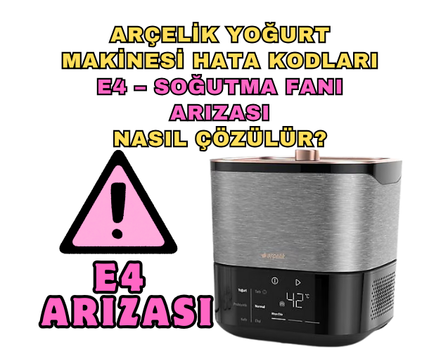 Arçelik yoğurt makinesi E4 hatası, E4 hata kodu nedir, yoğurt makinesi fan arızası, Arçelik yoğurt makinesi hata kodları, E4 hata kodu nasıl çözülür, yoğurt makinesi soğutmuyor, Arçelik teknik destek, yoğurt makinesi fan kontrolü, yoğurt makinesi parça değişimi, Arçelik yetkili servis, yoğurt makinesi bakım ipuçları, yoğurt makinesi soğutma problemi